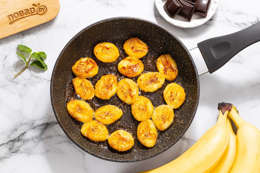 После подготовьте начинку из бананов. Бананы нарежьте толстыми кружочками. В сковороде растопите сахар вместе с растительным маслом. Обжарьте бананы до карамельного цвета с двух сторон.