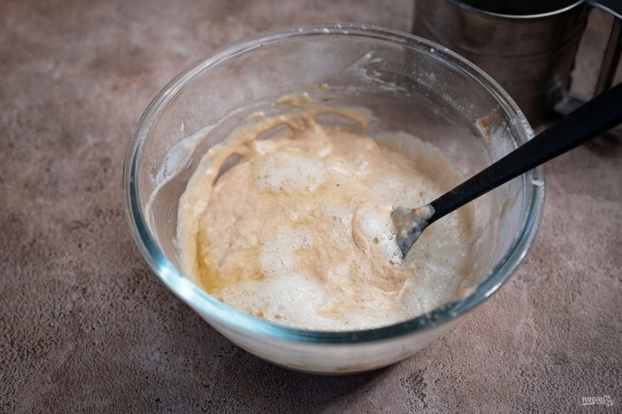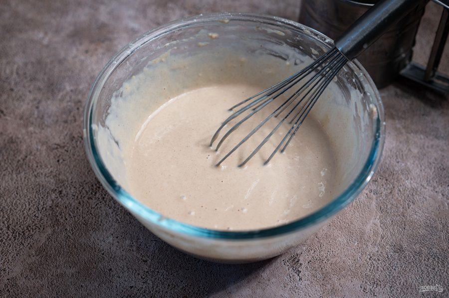 Вмешайте его венчиком в тесто. В итоге должно получиться чуть густоватое блинное тесто.