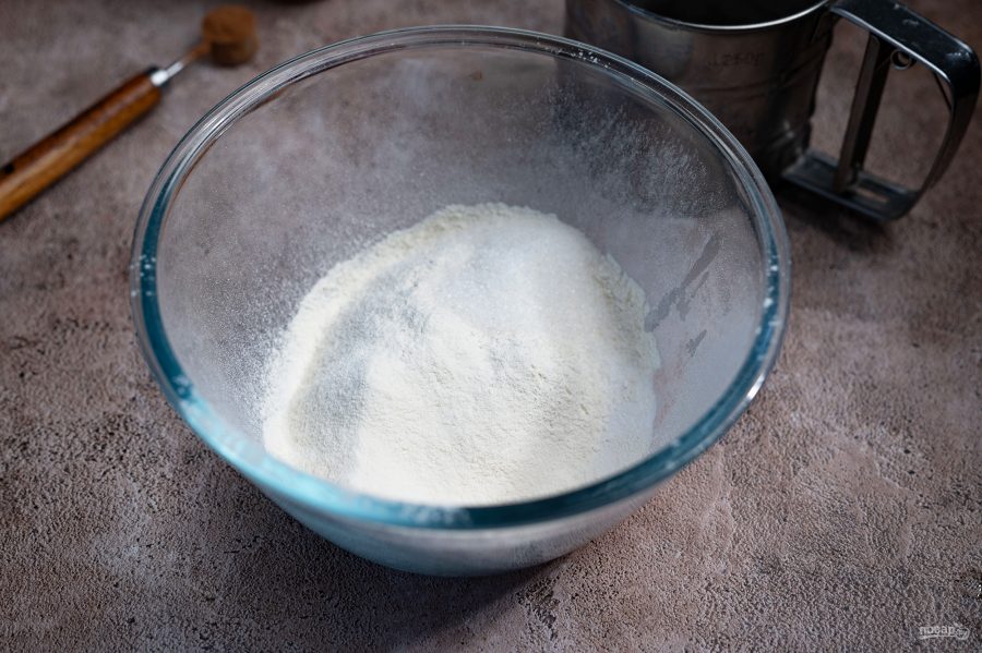 В другую миску просейте муку, добавьте к ней сахар, соду. Перемешайте.