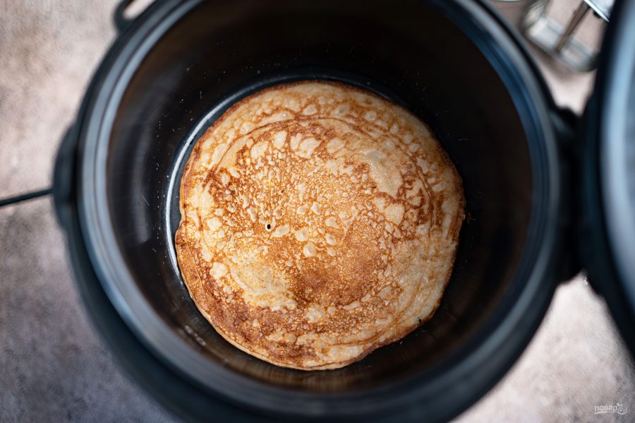 слоем растительного масла с помощью силиконовой кисточки, выложите порцию теста и распределите его ложкой, формируя блинчик. Обжаривайте блинчик сначала с одной