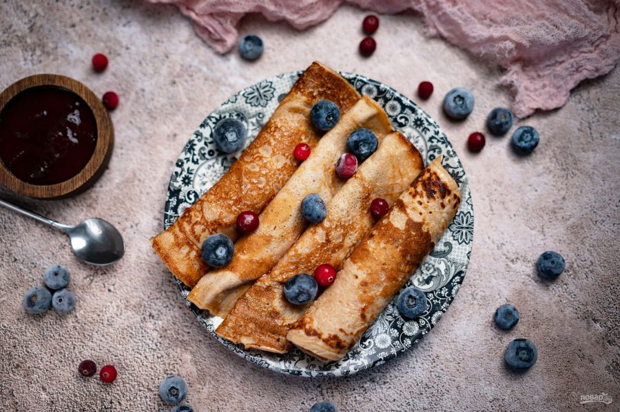 Готовые блинчики подавайте к столу горячими с любимым джемом и ягодами.
