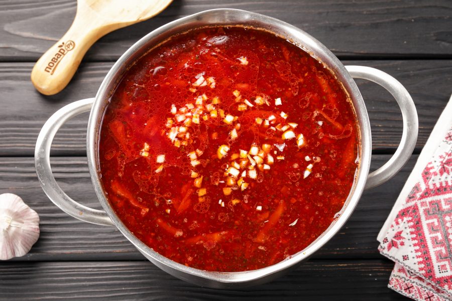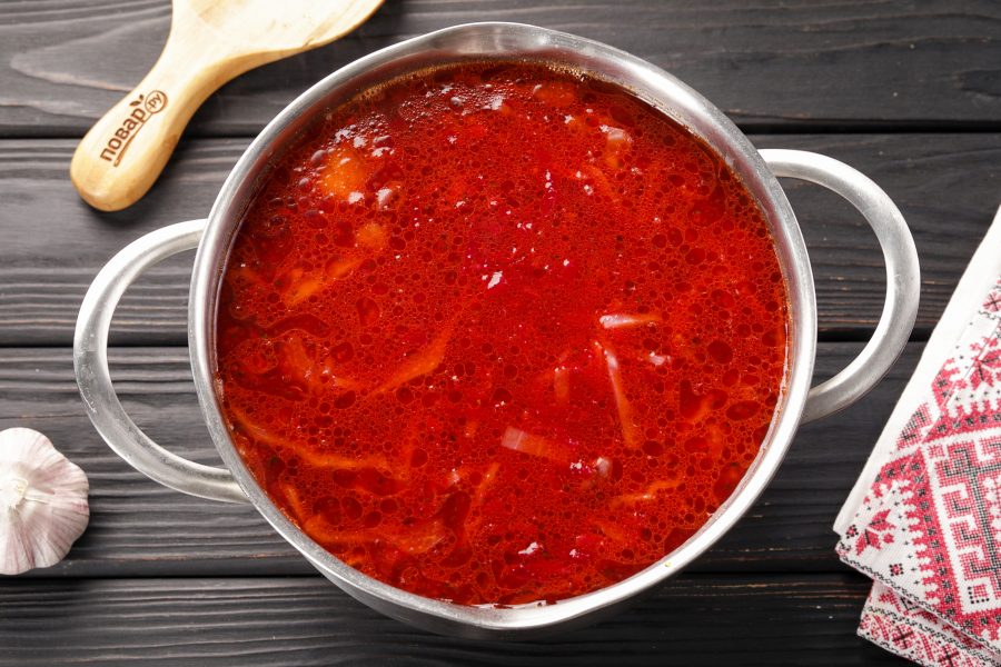 Отрегулируйте на соль и как только борщ закипит, уменьшите огонь до минимума и потомите ещё около 5-7 минут.