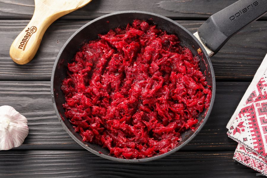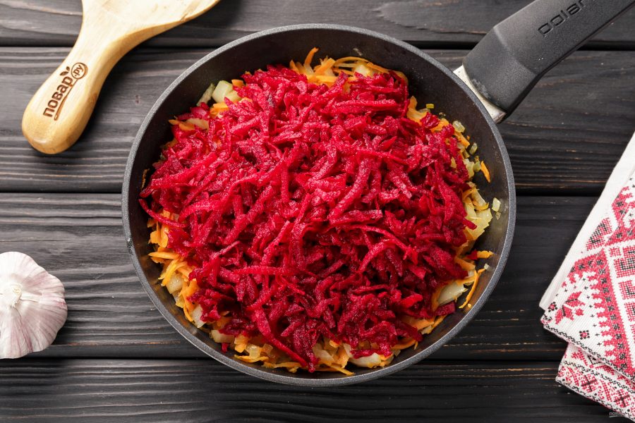 Свеклу натрите на крупной тёрке. Добавьте в сковороду.