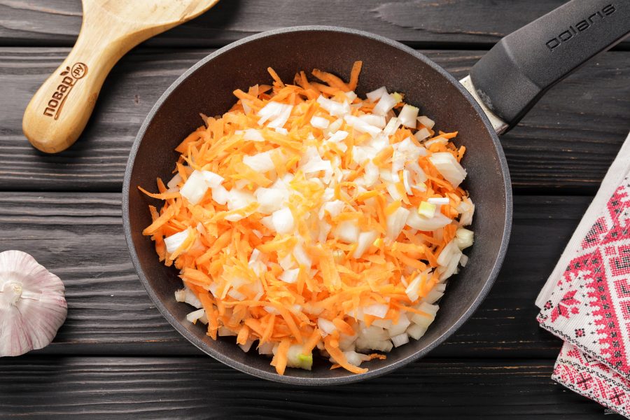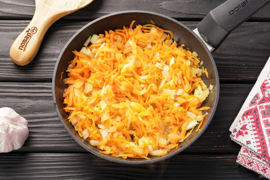 В это время сделайте зажарку. Морковку натрите на крупной тёрке. Лук нарежьте небольшими кубиками. В сковороде разогрейте растительное масло и отправьте овощи пассероваться.