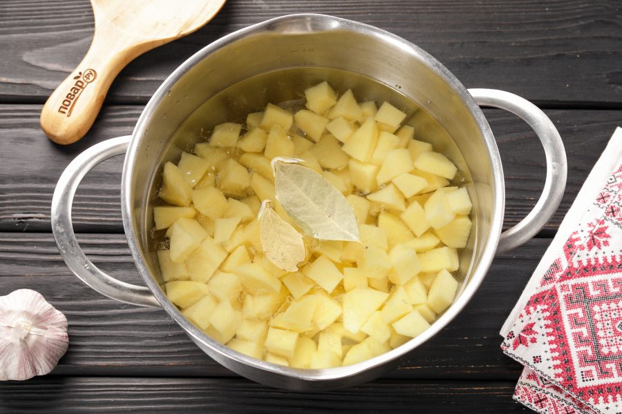 Картошку нарежьте небольшими кубиками или брусочками, как вам больше нравится. В кастрюлю налейте холодную воду, добавьте лавровый лист и отправьте картошку вариться. На сильном огне доведите до кипения, далее пламя убавьте до умеренного и варите около 15-20 минут.