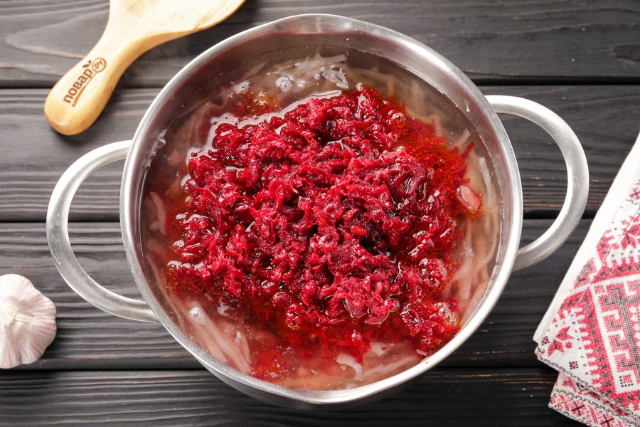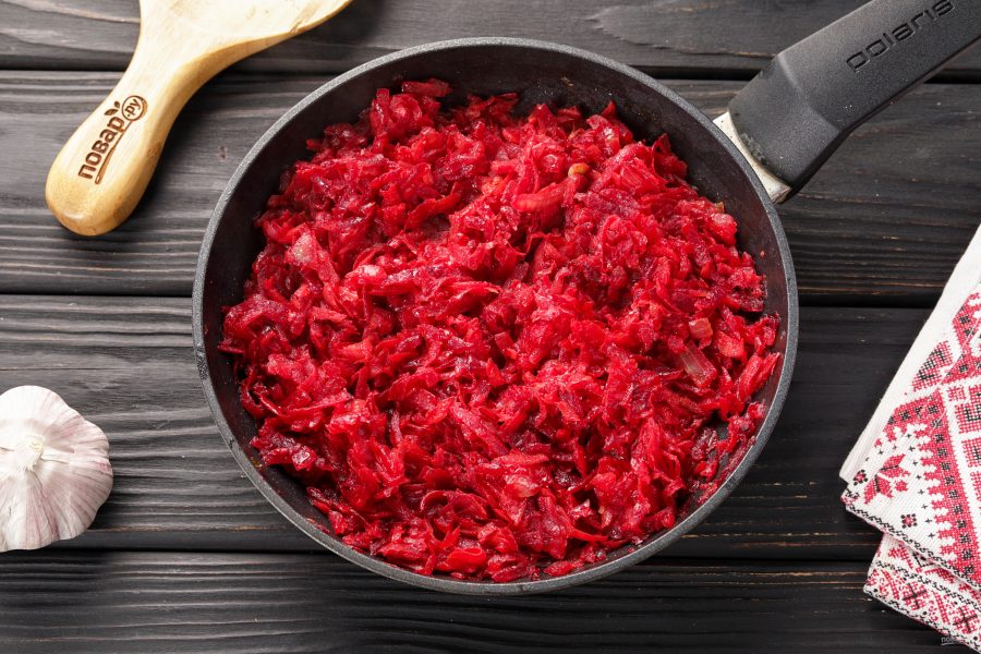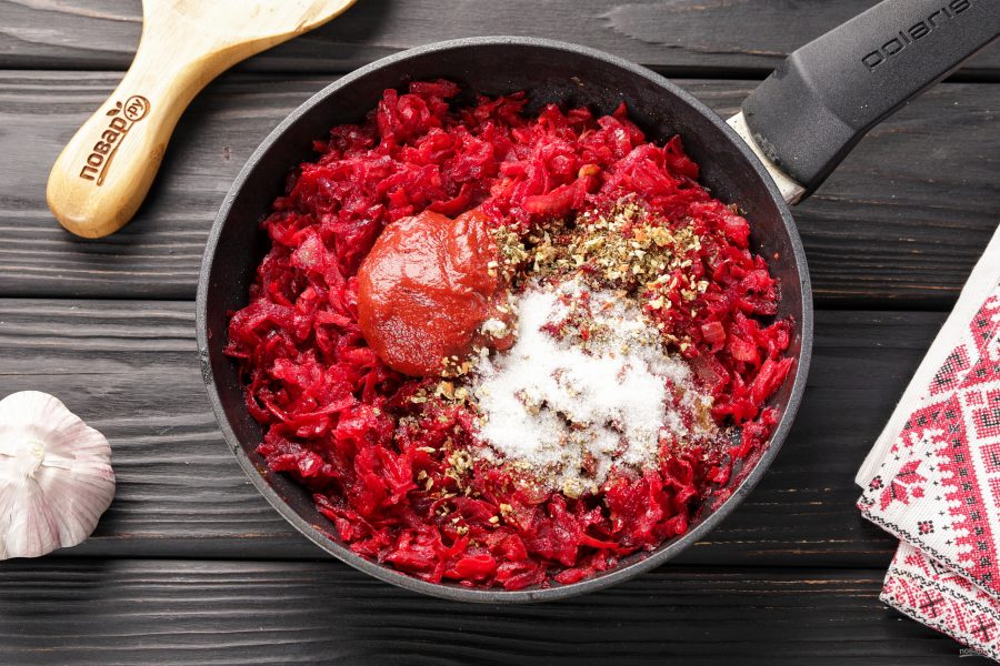 Перемешайте, уменьшите огонь до минимума и тушите около 10 минут или до готовности свеклы.