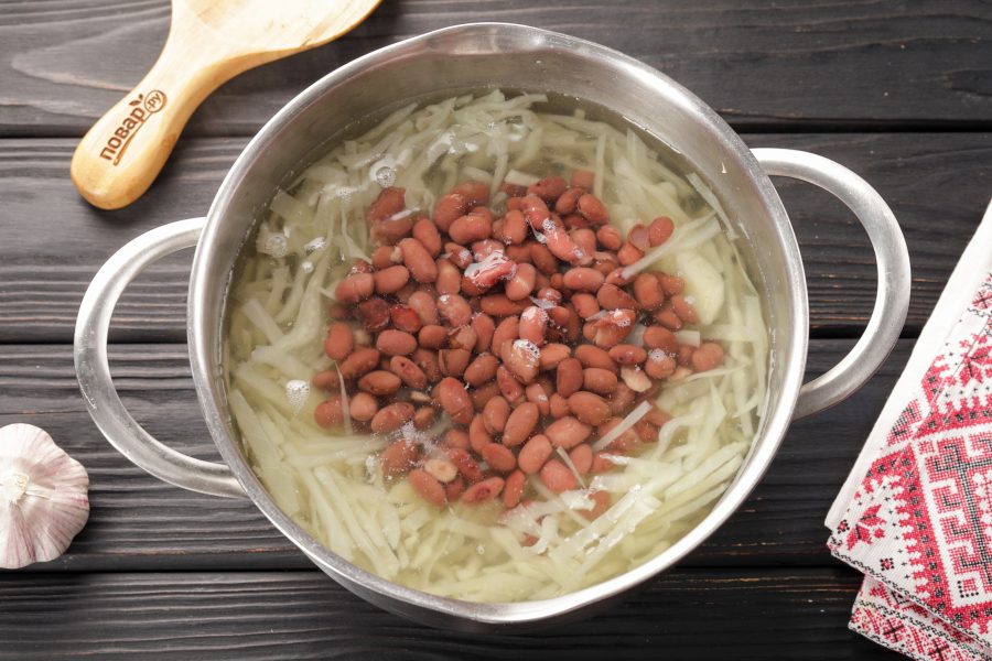 Когда картофель будет практически готов, добавьте в кастрюлю фасоль.