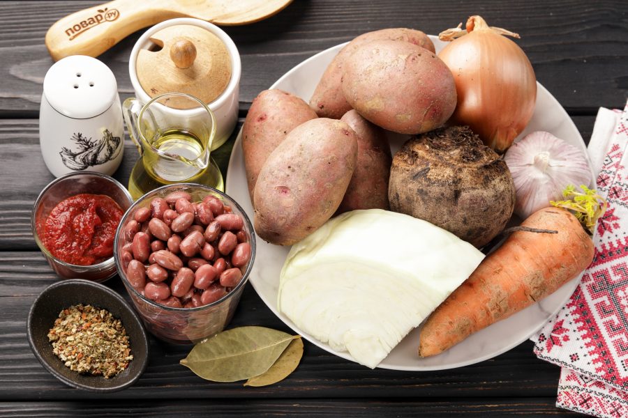 Подготовьте все ингредиенты по списку. Если вы возьмёте консервированную фасоль, то борщ приготовите в считанные минуты. Если же вы используете обычную сухую фасоль, то её следует предварительно замочить, а затем отварить до готовности.