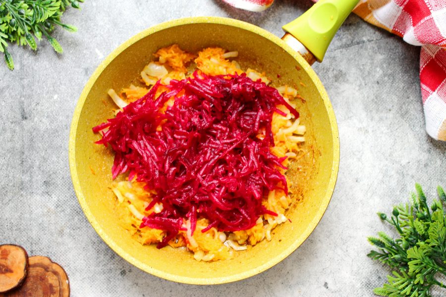 Сырую терку натрите на крупной терке и добавьте в сковороду с овощами. Отварная свекла нам не понадобится, так как она нужна была для насыщенного цвета и вкуса бульона. Влейте уксус и все перемешайте. Обжаривайте овощи на среднем огне, перемешивая, в течение 10 минут.