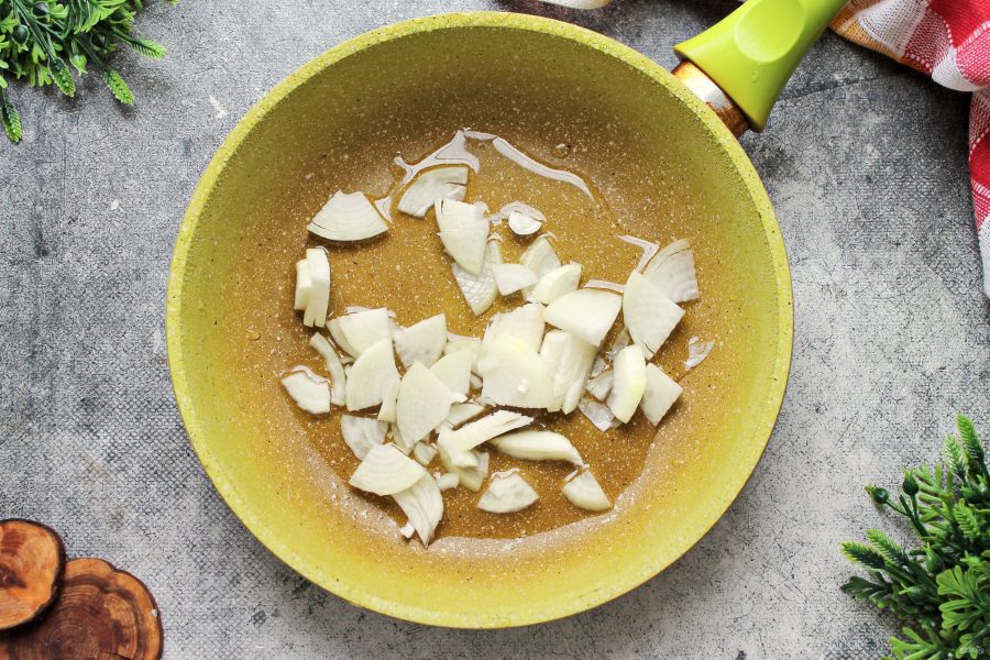 В сковороду налейте растительное масло и разогрейте на среднем огне. Репчатый лук порежьте и выложите в сковороду.