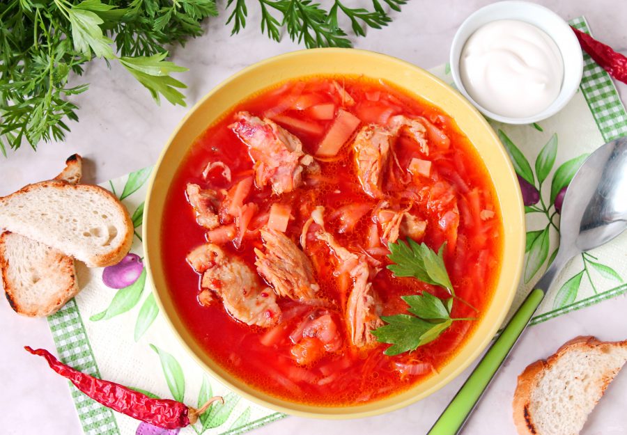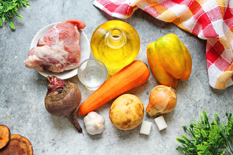 Свекла — главный герой этого блюда, которая придает борщу характерный цвет и невероятно полезные свойства. В сочетании с болгарским перцем, картофелем и морковью, так же нежной свининой, станет не только сытным, но и полезным блюдом для всей семьи. Подают его в горячем виде, со сметаной и свежей зеленью. И не забудьте подать к нему черный хлеб, который идеально дополнит его вкус.Состав / Ингредиенты: