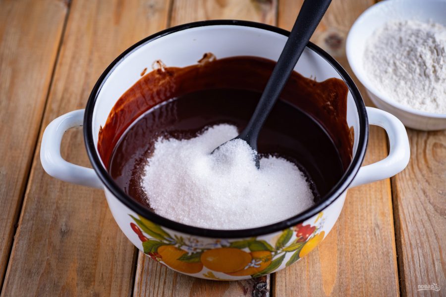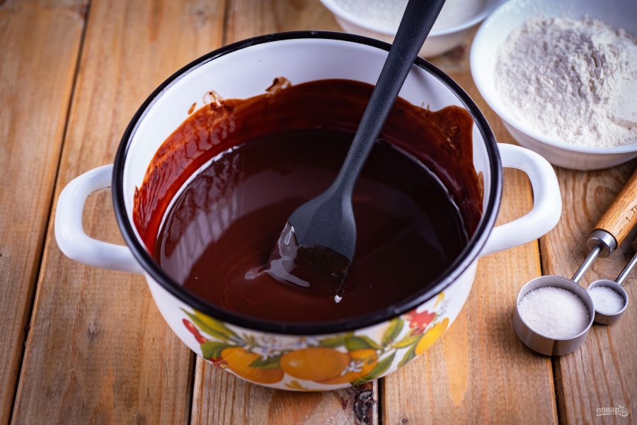 На маленьком огне растопите эти ингредиенты, помешивая лопаткой, до получения однородной, зеркальной смеси.