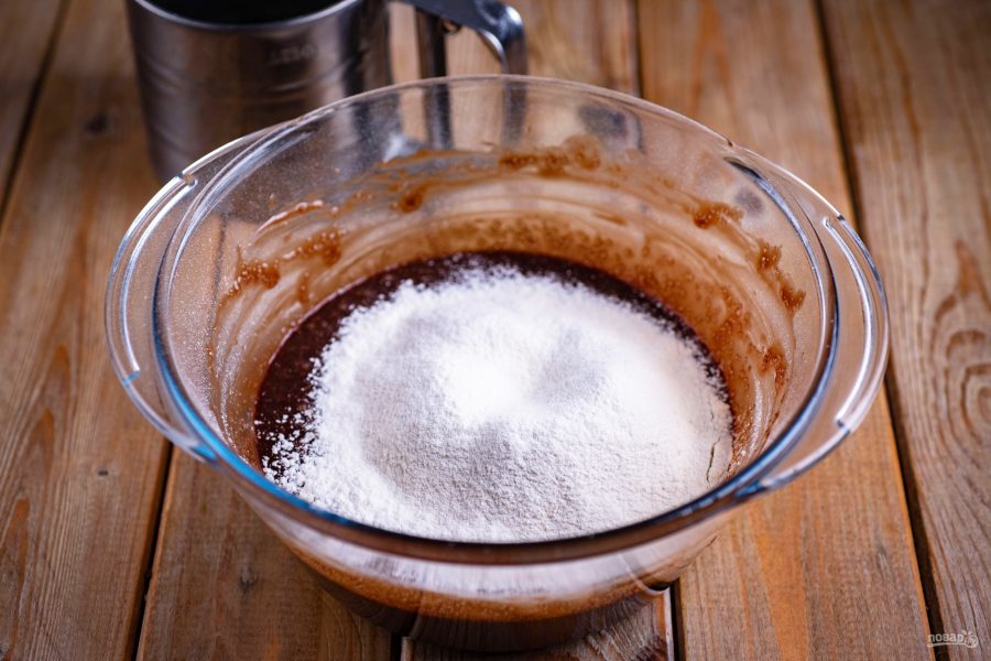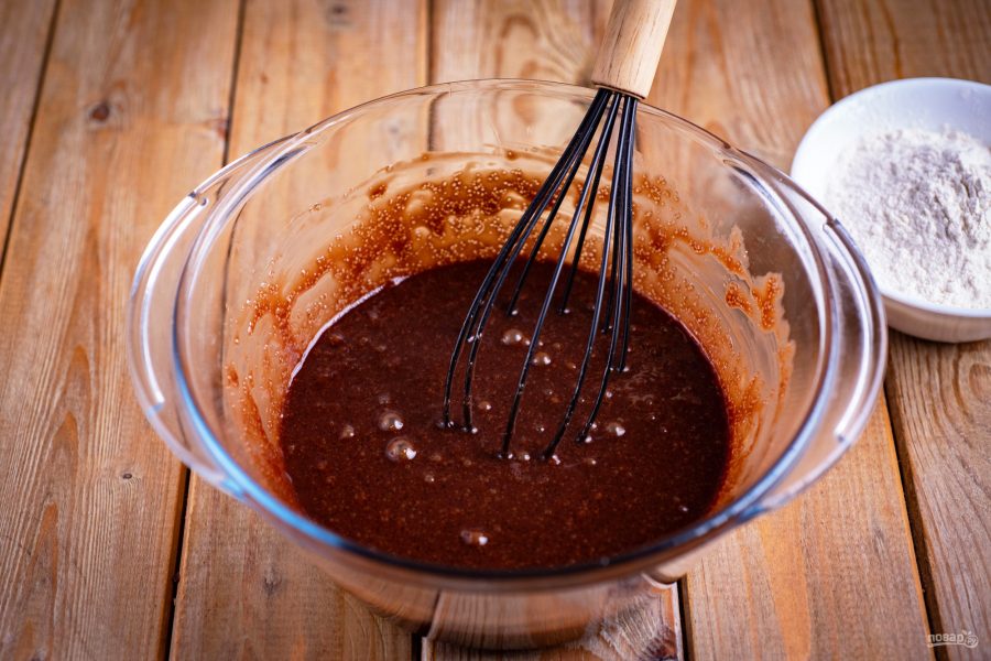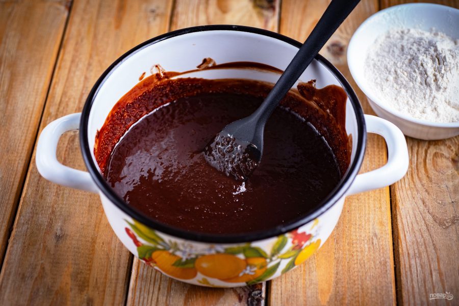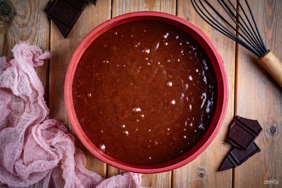 В итоге получается текучее, густое, шоколадное тесто, которое выложите в форму для выпекания. На дно формы можно предварительно положить кусочек пергамента.