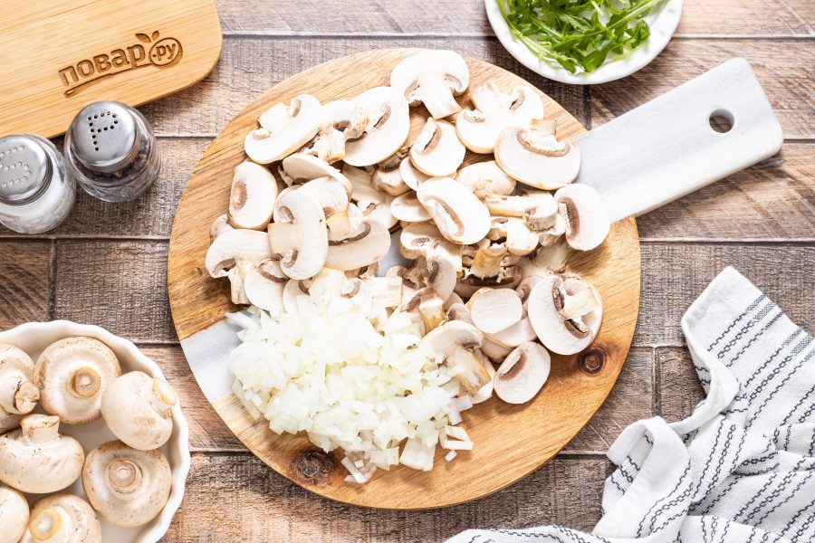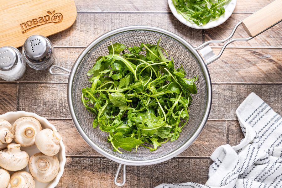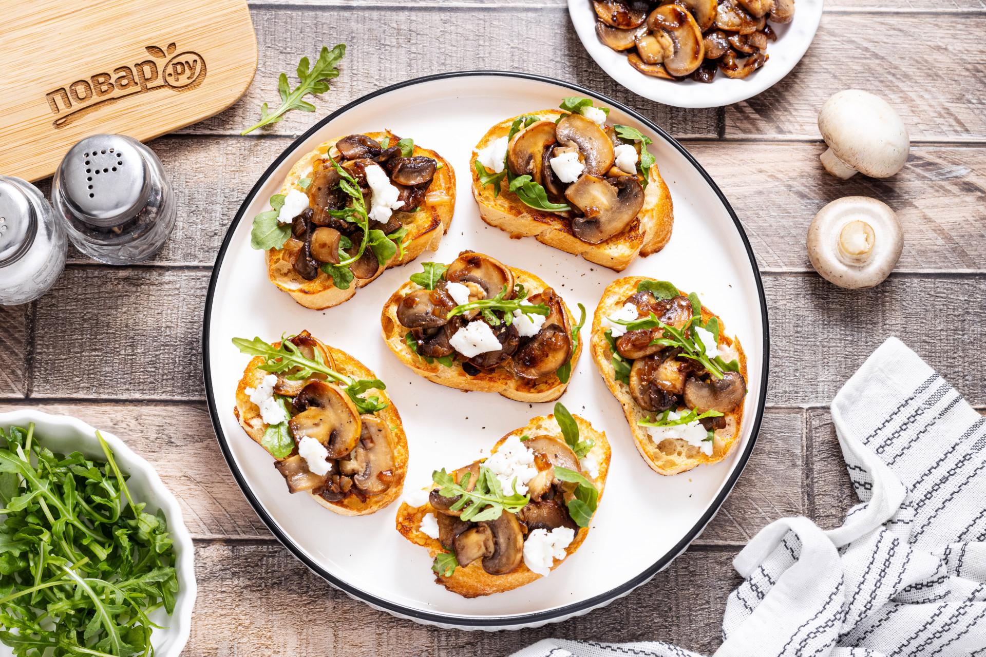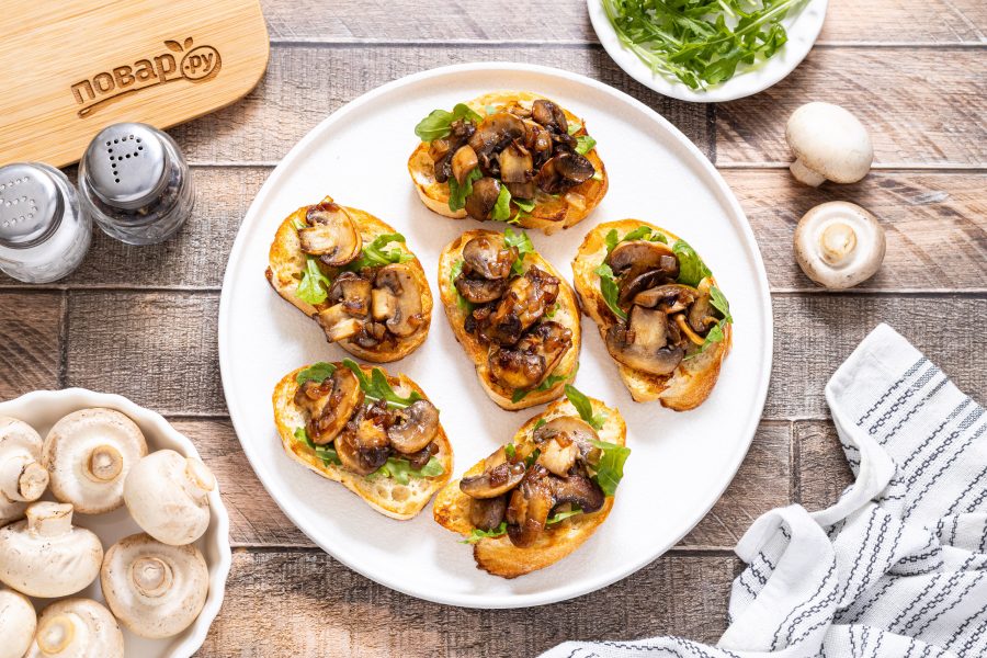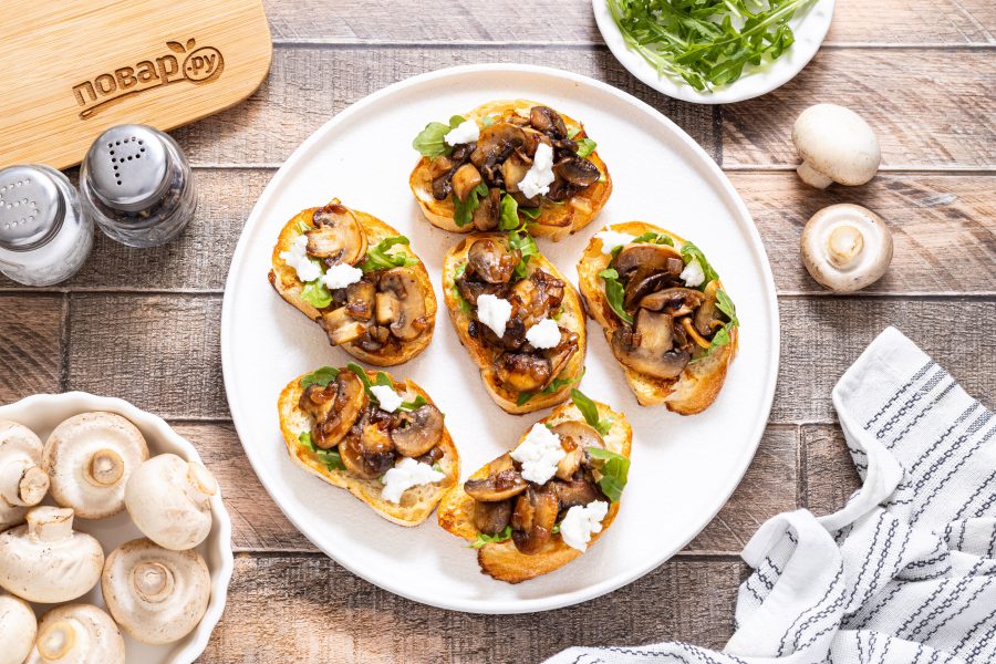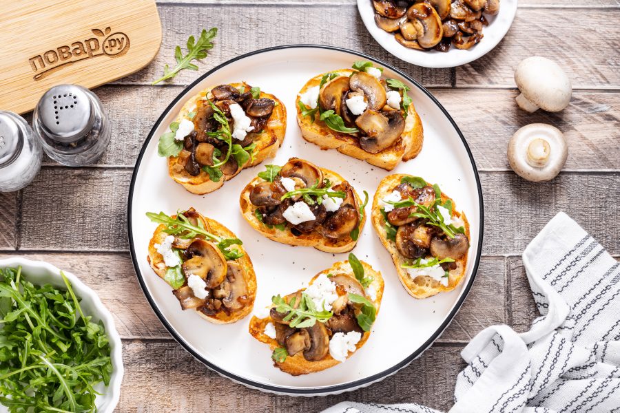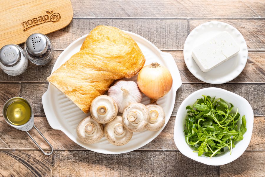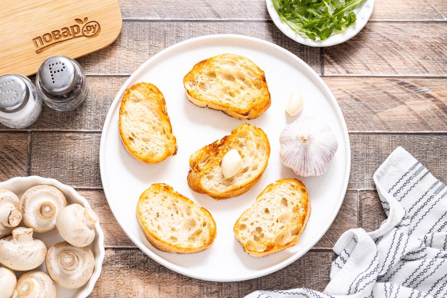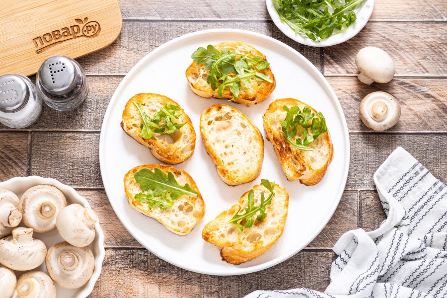 Ниже я расскажу подробнее, как как приготовить брускетту с грибами. Вместо багета можно использовать хлеб чиабатта или в крайнем случае батон. Шампиньоны можно заменить на другие грибы, например, вешенки или лисички. Лесные грибы тоже подойдут, но предварительно их отварите. Сочетание вкусов здесь получается просто замечательным! Чуть сладковатые грибы оттеняет горчинка руколы и нежный сливочный вкус сыра, и все это подается на хрустящем ломтике багета.Состав / Ингредиенты: