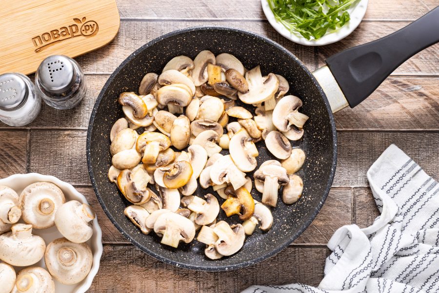 На сильном огне обжарьте грибы с небольшим количеством оливкового масла до румяного цвета. Из них должна выпарится основная жидкость.