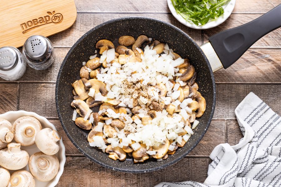 После убавьте температуру, добавьте репчатый лук и жарьте до его мягкости. В конце посолите и поперчите.
