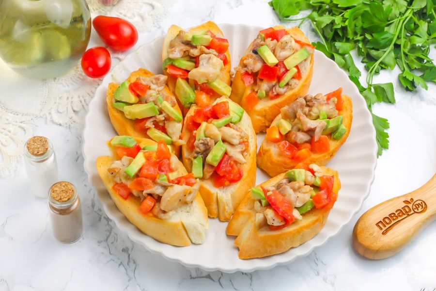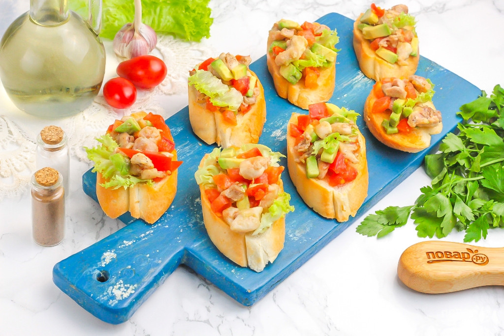 Дополните красочные брускетты листовым салатом, петрушкой или другой свежей зеленью и подайте к столу. Приятного вам аппетита!