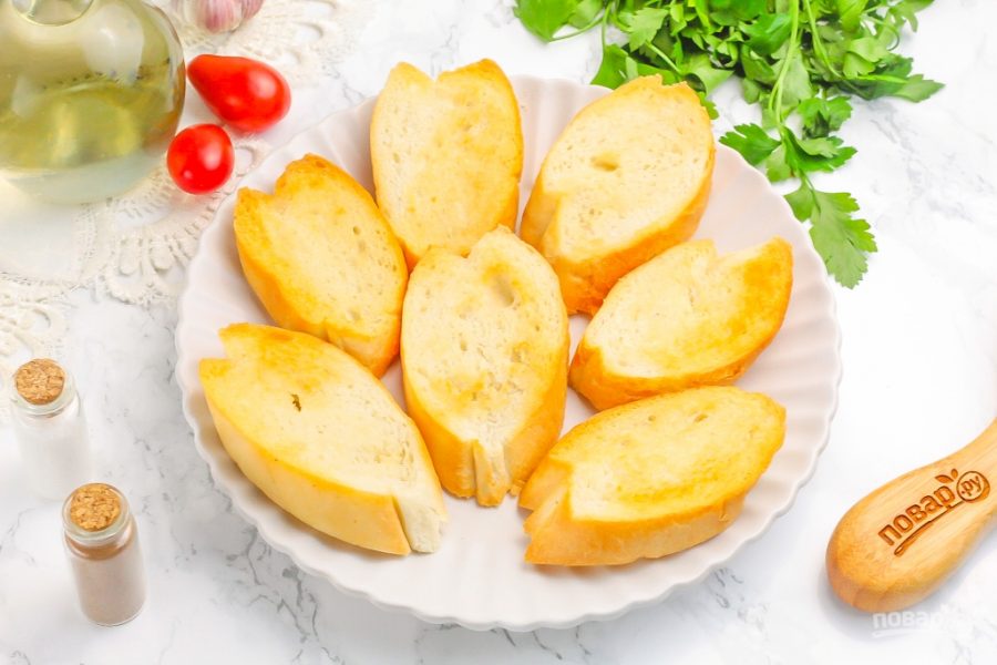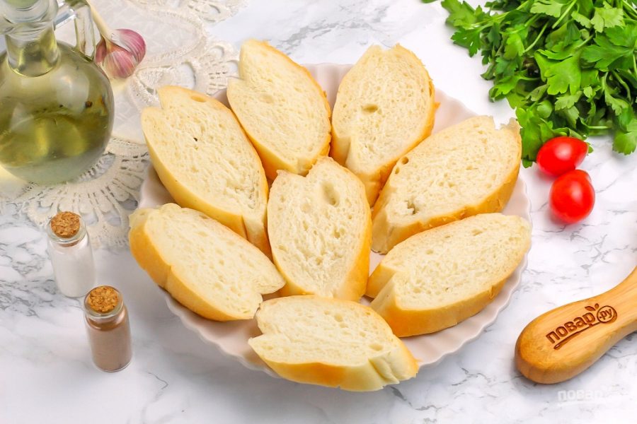 Подготовьте указанные продукты. Приобретите багет или уже готовые подсушенные порционные гренки в магазине.