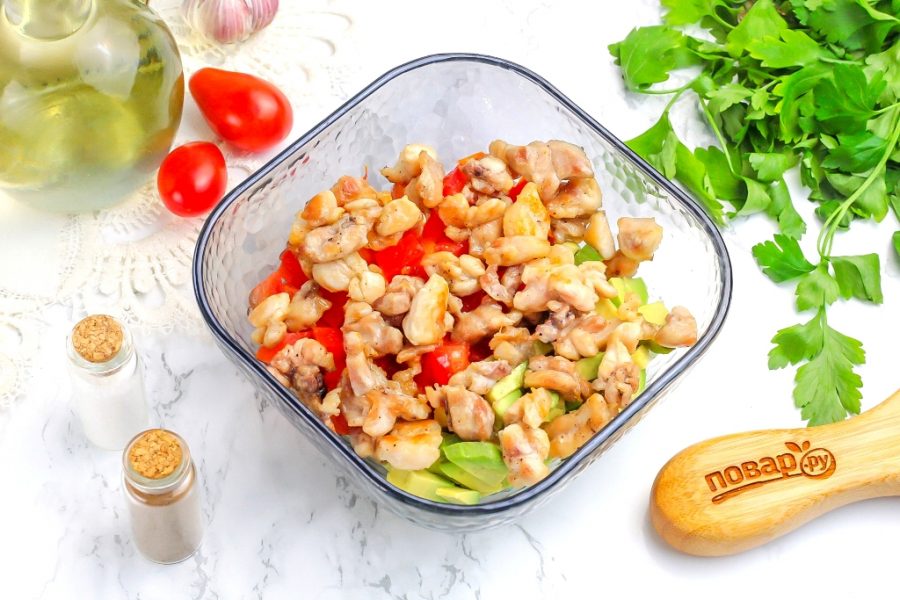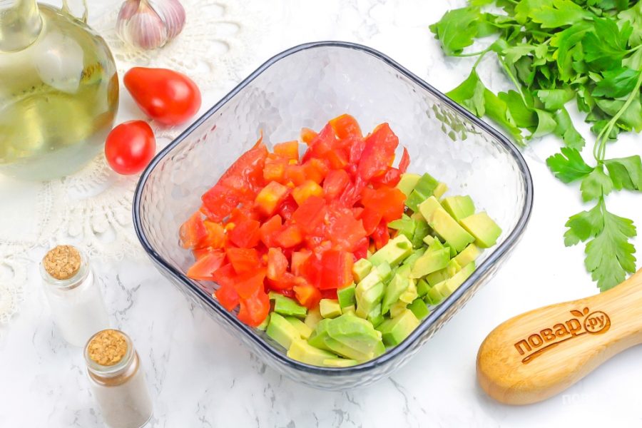 Очистите авокадо и промойте помидор. Нарежьте мелкими кубиками и выложите мякоть в пиалу или креманку. Можно добавить свежий огурец или зеленый, красный лук.