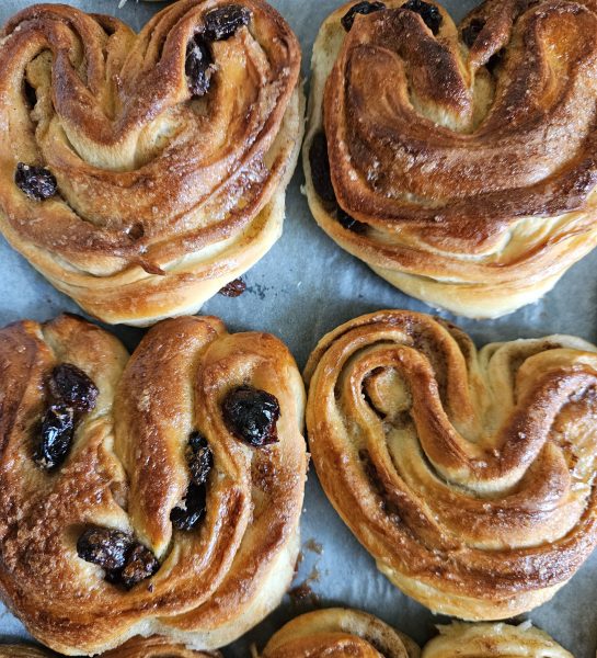 Разверните булочку срезом вверх и осторожно расправьте слои. Так мы получим милые плюшки сердечком.