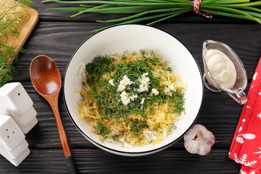 Добавьте рубленый укроп и давленый чеснок.