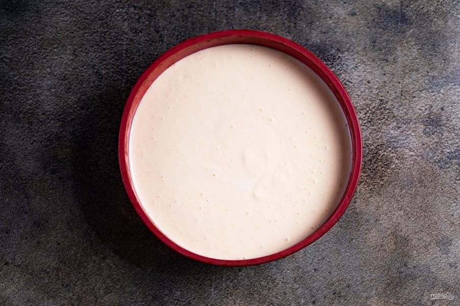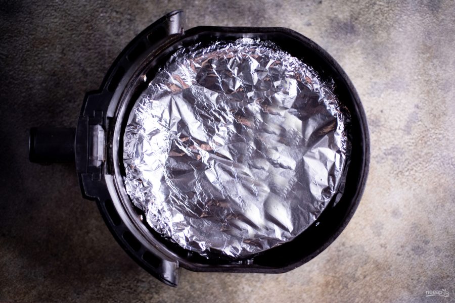 Форму с будущим чизкейком хорошенько укройте фольгой и поместите на нижнюю решетку чаши аэрогриля. Выпекайте чизкейк в аэрогриле при температуре 150 градусов. Я выпекала чизкейк в течение 1.5 часов. Хочу обратить ваше внимание, что мощность у разных аэрогрилей может отличаться и поэтому время вашей выпечки может отличаться от моего.