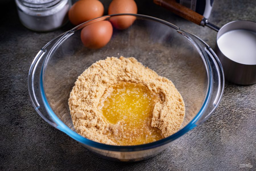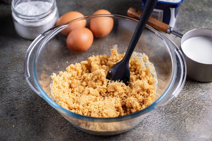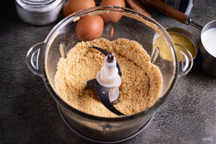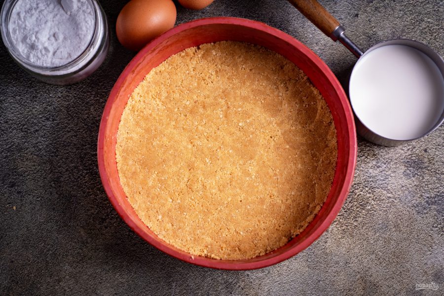 Для приготовлении в аэрогриле я использую силиконовую форму — это очень удобно. На дно формы выложите всю песочную массу и утрамбуйте ее в равномерный слой с помощью толкушки или донышка стакана.