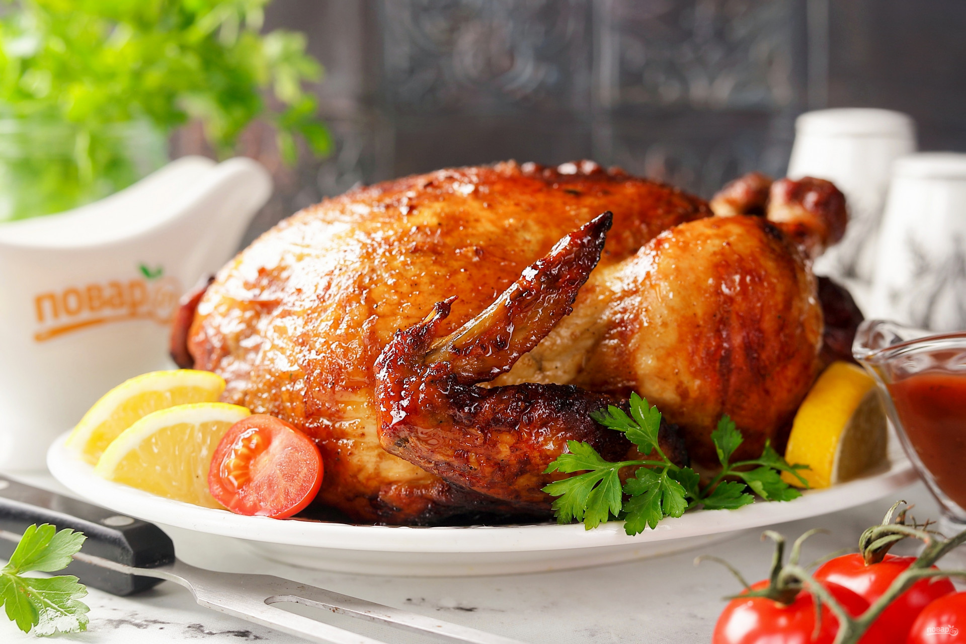 Степень поджаристости цыплёнка можете смело регулировать по своему усмотрению. Для этого можно увеличивать температуру, а так же время приготовления. Обязательно периодически проверяйте процесс, чтобы не допустить подгорания. Проверяйте готовность так: вставьте зубочистку в самую мясистую часть грудки, если выделяющийся оттуда сок прозрачный (а не розоватый), то цыплёнок готов к подаче. Запечённая тушка — это всегда празднично! Такой вариант приготовления подойдёт идеально для всей семьи, ведь сочную нежную грудку без кожи можно предложить даже самым маленьким. Рецепт очень удачный — не оторваться! Рекомендую непременно попробовать и побаловать близких!Состав / Ингредиенты: