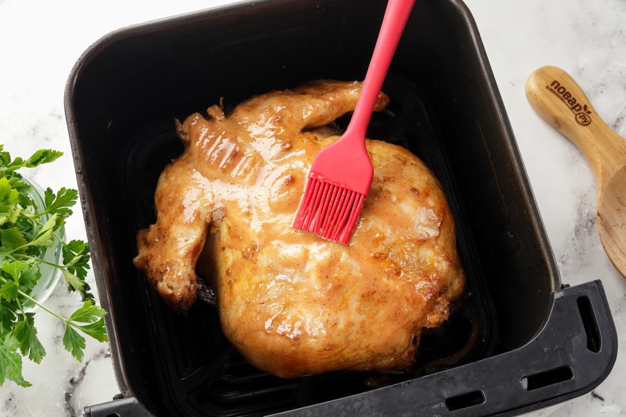 Затем переверните и смажьте остатками маринада. Готовьте ещё 20 минут. После окончания программы проверьте цыплёнка на готовность, если необходимо, увеличьте температуру до 180 градусов и запекайте ещё 10 минут.