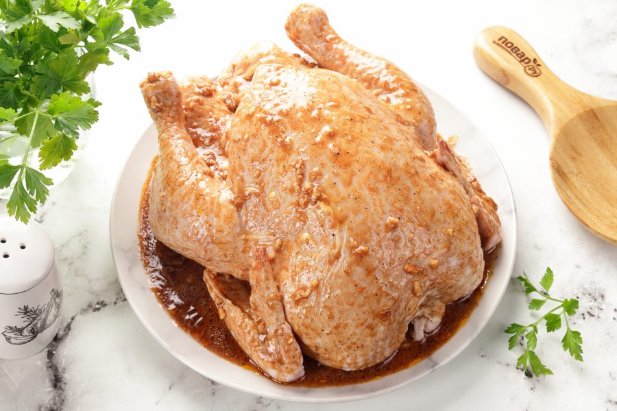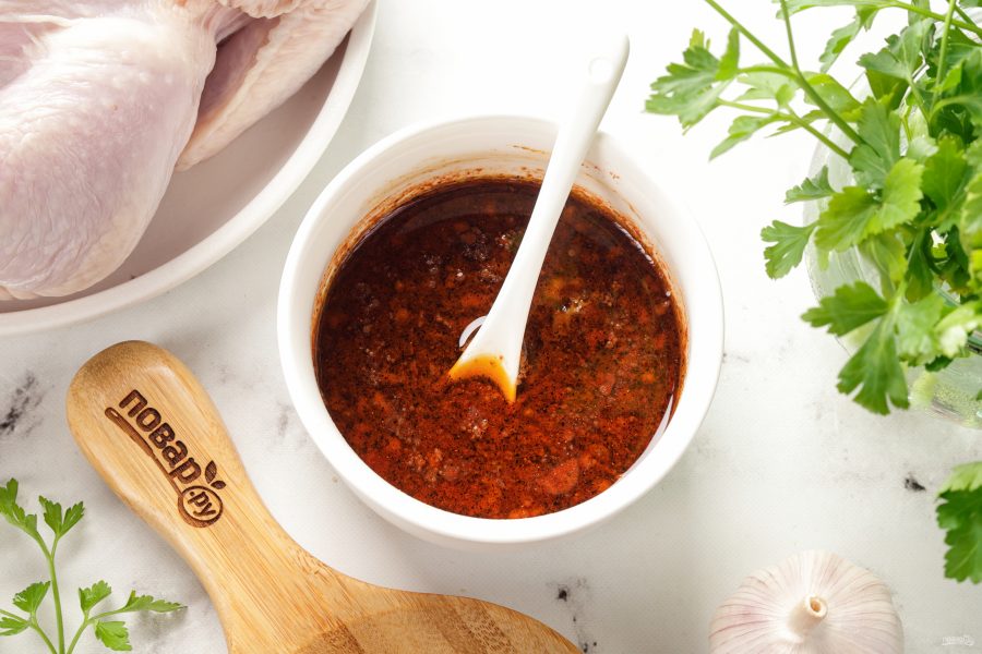 Цыплёнка хорошо вымойте (в том числе и внутри). Удалите гузку (хвостик) и лишний жир. Тщательно натрите курицу маринадом снаружи и внутри.