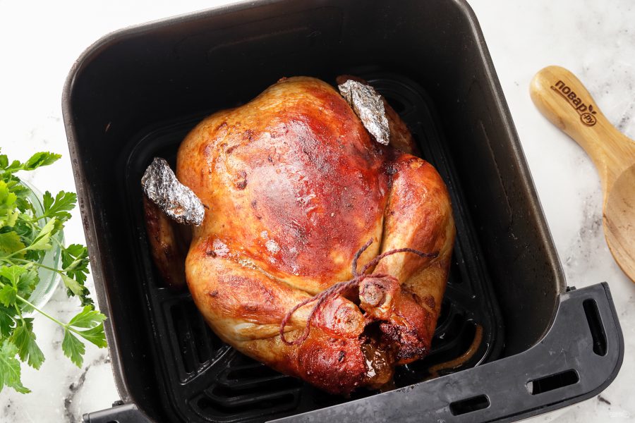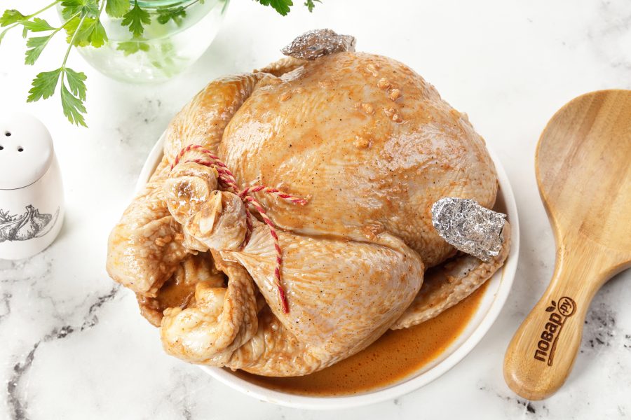 Оберните кончики крыльев в фольгу, чтобы тонкие кончики не сгорели и не высохли раньше, чем приготовится основная часть тушки. Ножки перевяжите кулинарной нитью.