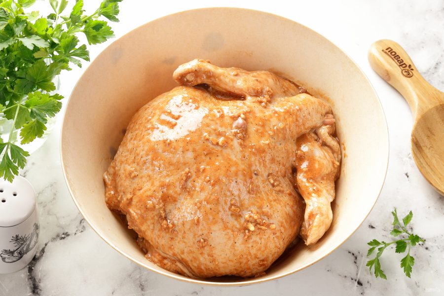 Переложите цыплёнка в глубокую миску. Полейте остатками маринада. Затяните пищевой плёнкой и уберите в прохладное место на несколько часов. У меня курица мариновалась ночь. Чем дольше маринуется курочка, тем она будет вкуснее. Примерно за час до начала приготовления достаньте курицу из холодильника, дайте ей постоять при комнатной температуре.