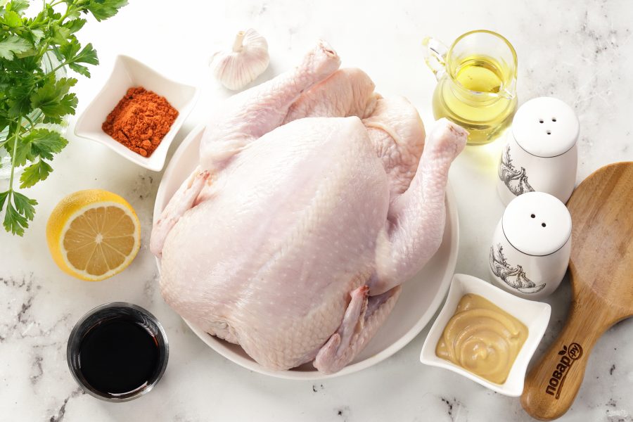 Подготовьте все ингредиенты по списку. У меня аэрогриль с чашей на 6,5 литров, в неё поместится курица до двух килограммов. Я взяла целую тушку весом 1,5 кг. Если чаша вашего аэрогриля 3-4 литра, то вам нужно взять курицу весом не более 1,2 кг.