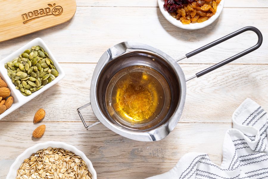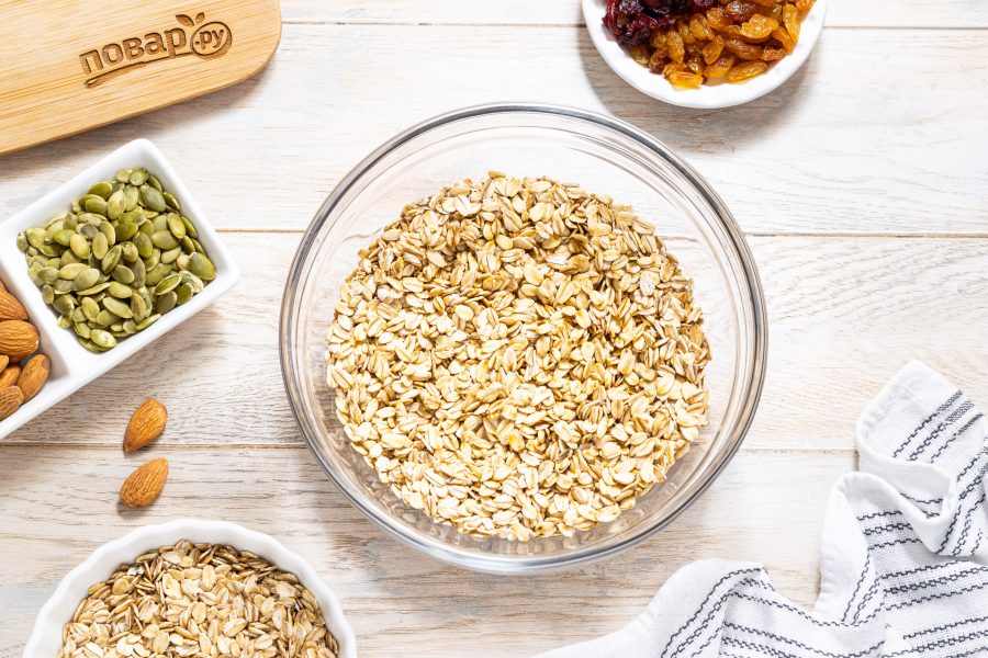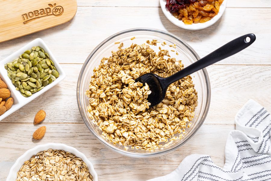 Все хорошо перемешайте, чтобы овсяные хлопья равномерно пропитались сладкой смесью.