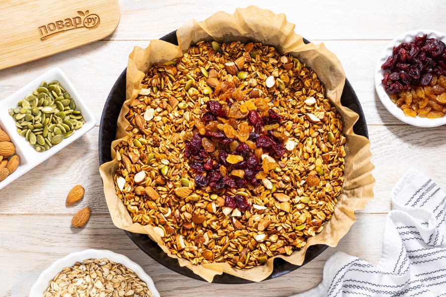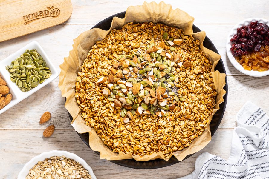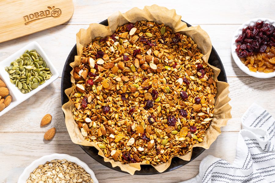 Мюсли и орехи с семечками должны хорошо подрумяниться. После добавьте изюм и вяленую вишню.