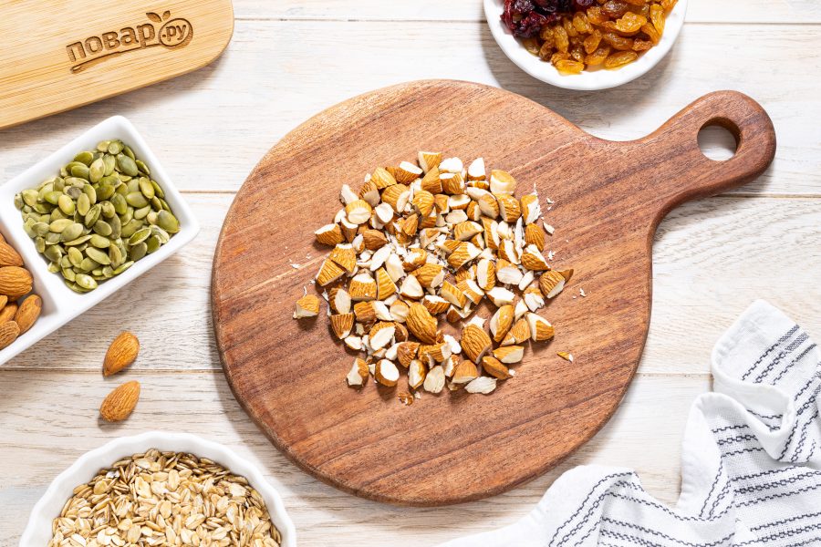 Крупно порубите миндальные орехи.