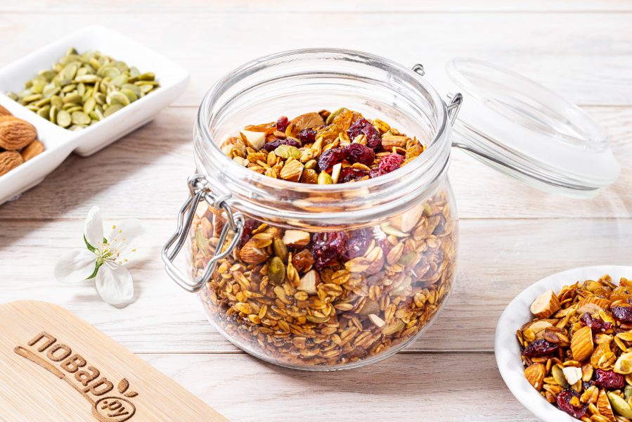 А после переложите в стеклянную банку с крышкой для хранения. Домашние мюсли готовы, приятного вам аппетита!