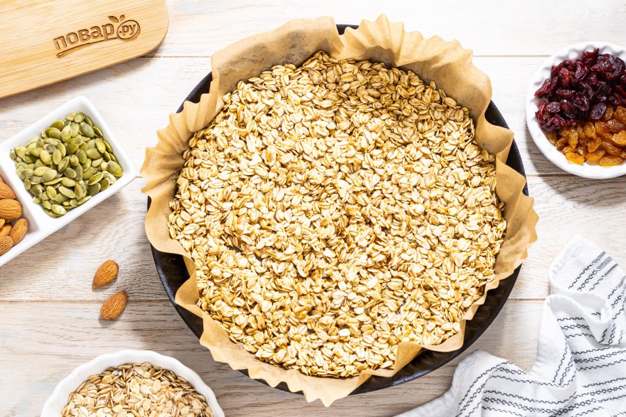 Выложите овсяные хлопья на пергамент для выпечки тонким слоем. Выпекайте в разогретой до 160 градусов духовке 20 минут. Периодически помешивайте.