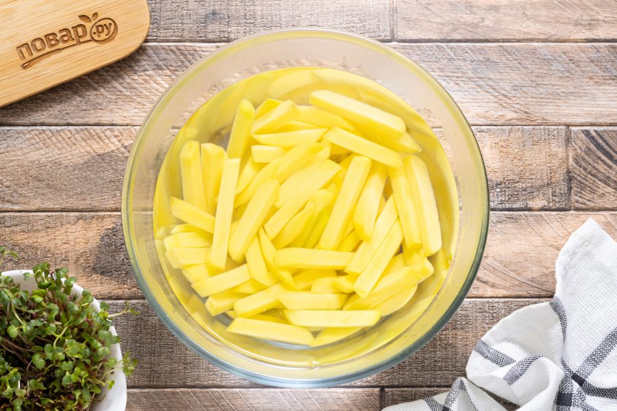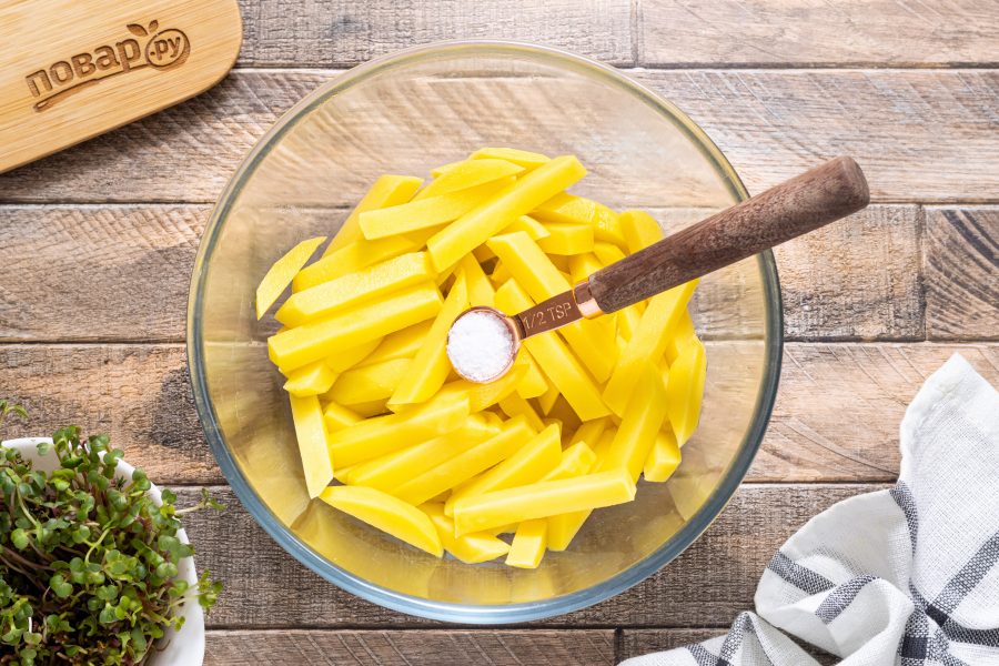 Переложите картофель в глубокую миску. Добавьте соль, перемешайте и оставьте на 5 минут.