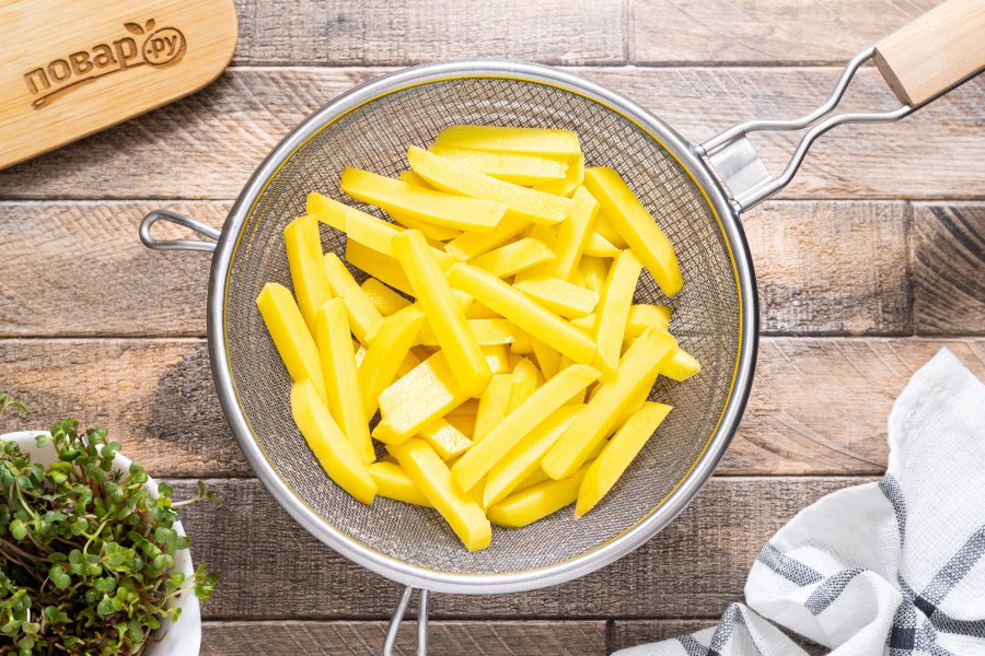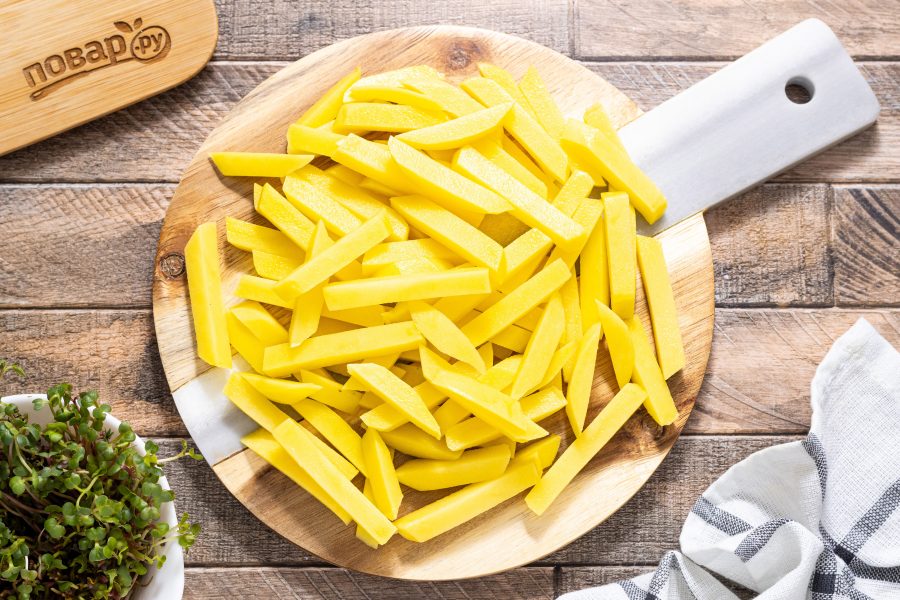 Нарежьте картофель брусочками одинакового размера. Можно использовать специальную овощерезку.