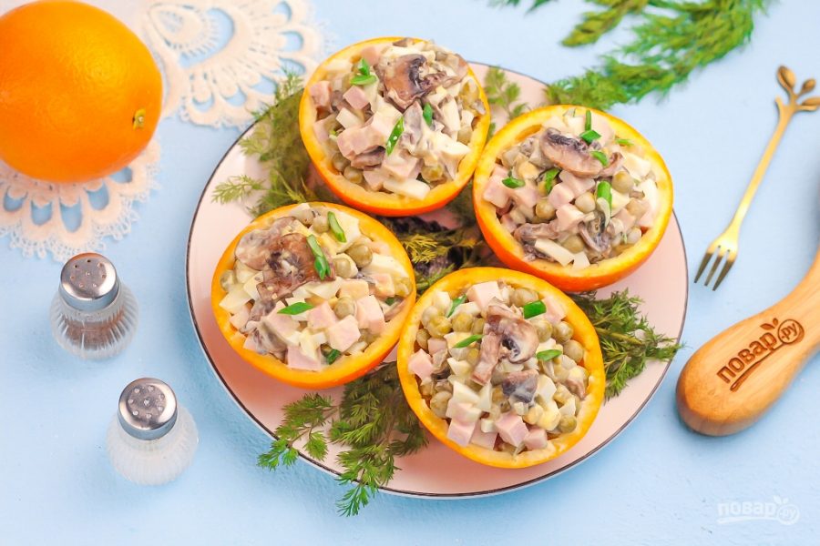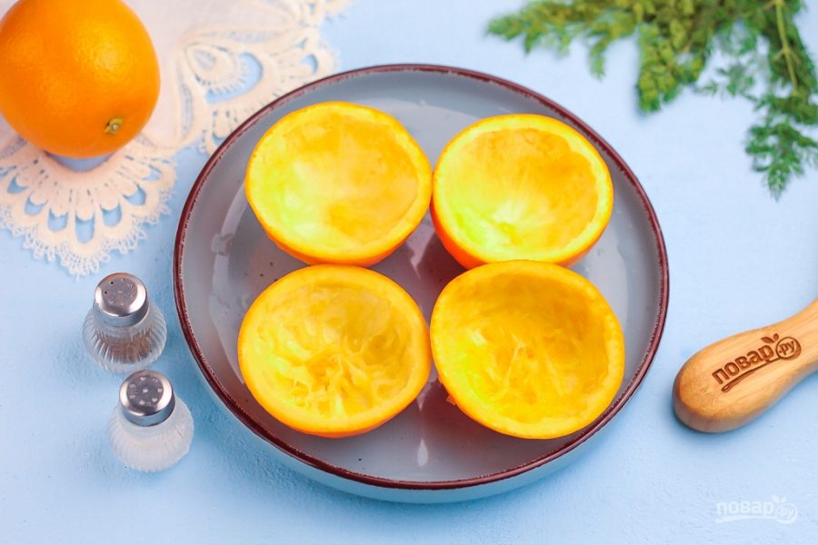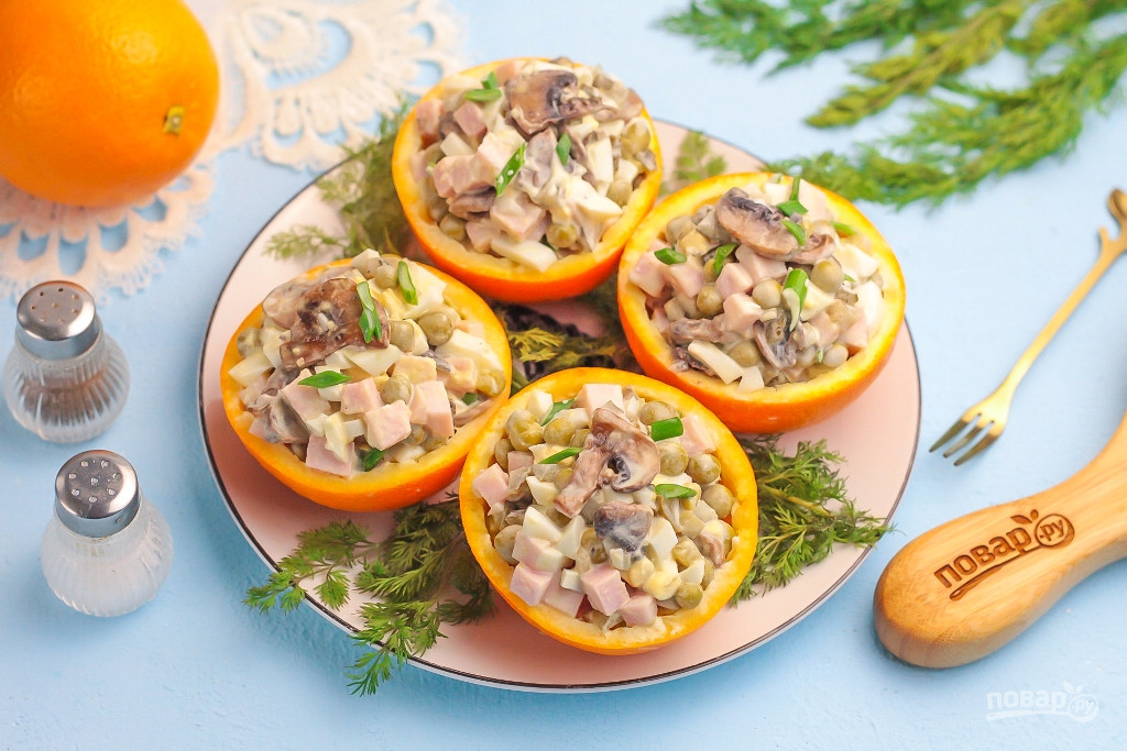 Яркая закуска в апельсинах точно придется по душе всем гостям на празднике. Вы можете нафаршировать их любым салатом, нарезкой фруктов и т.д. Подавать закуску нужно охлажденной, украсив зеленью.