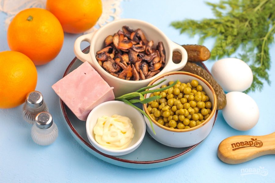 Подготовьте указанные продукты. Вареную колбасу можно заменить копченой, а жареные грибы — маринованными. Заранее отварите куриные яйца в течение 12 минут и остудите в ледяной воде.