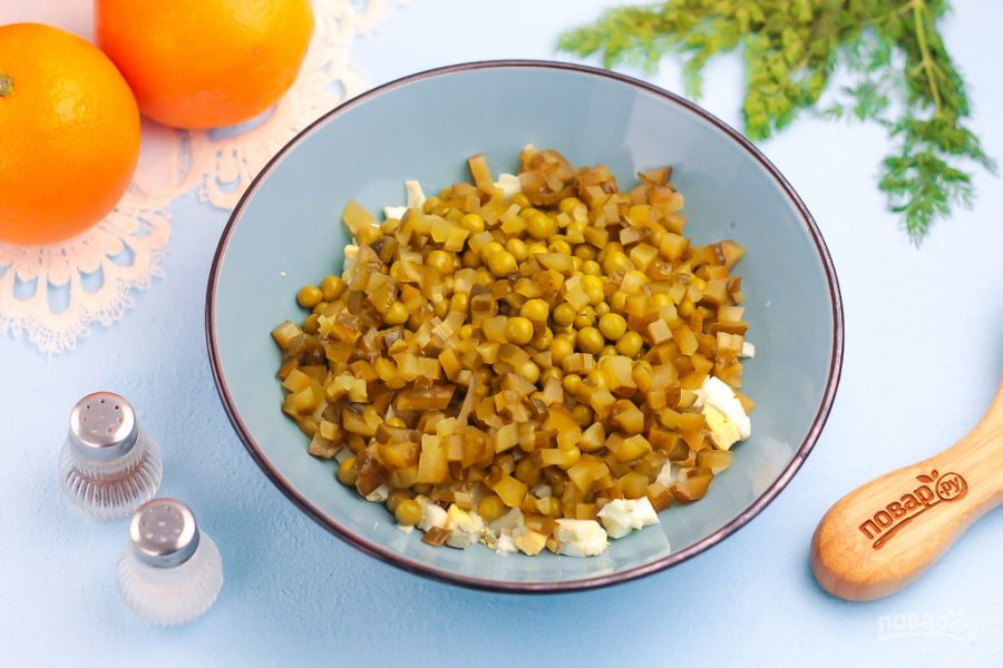 Добавьте жареные или маринованные грибы, майонез любой жирности, всыпьте соль и молотый черный перец. Аккуратно все перемешайте.