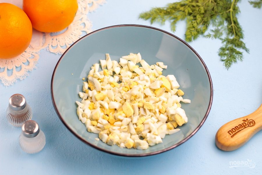 Очистите отварные яйца от скорлупы и промойте в воде. Нарежьте мелкими кубиками и высыпьте нарезку в салатник либо глубокую миску.
