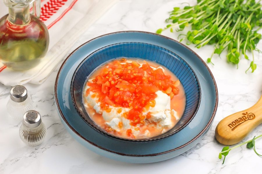 Слейте сок и нарежьте извлеченную мякоть мелкими кубиками. Выложите в пиалу или салатник творожный сыр, добавьте туда же томатную мякоть. Посолите, по желанию поперчите или добавьте другие специи, пряности. Очень выигрышно звучит с помидорами сушеный или свежий базилик, орегано.