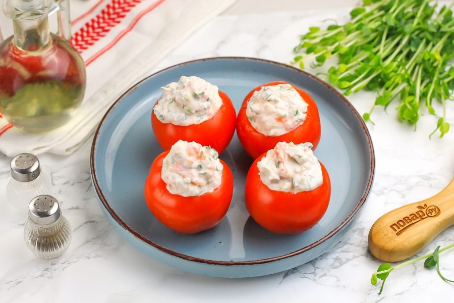 Аккуратно нафаршируйте очищенные помидоры, выкладывая начинку с горкой, формируя аппетитную "шапочку".