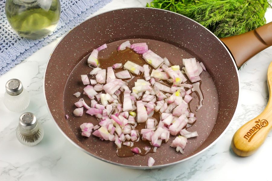 Очистите луковицу от кожуры и промойте в воде, нарежьте мелким кубиком. Отпассеруйте нарезку на сковороде с высокими бортиками в прогретом растительном масле примерно 3-4 минуты.