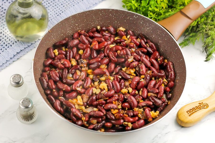 Добавьте к обжаренному луку отваренную фасоль из кастрюли. Помните, что она должна быть без жидкости.