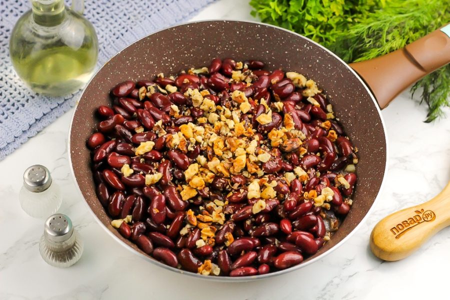Выложите фасоль с орехами в пиалу или креманку, украсьте свежей зеленью и подайте к столу. Она вкусна как в горячем, так и в холодном виде! Приятного вам аппетита!