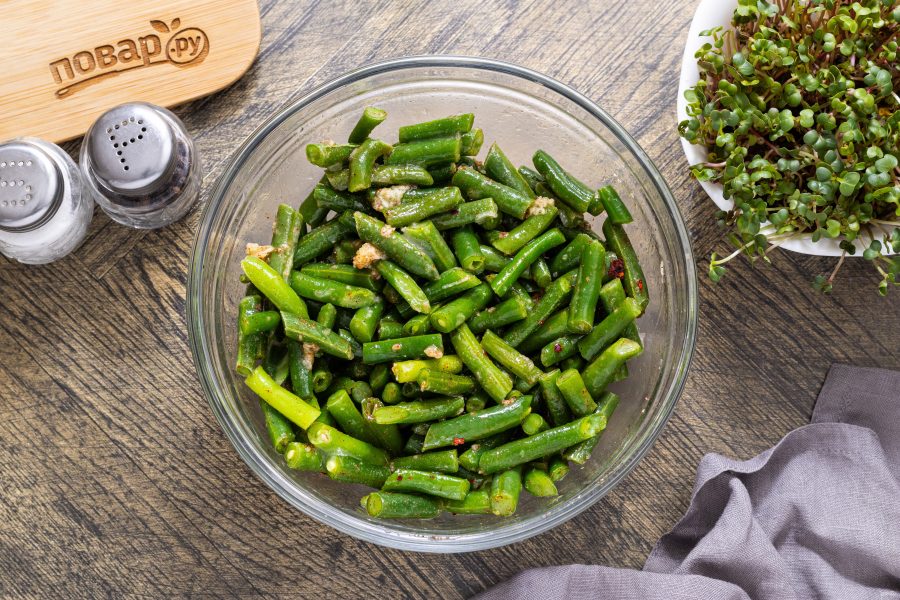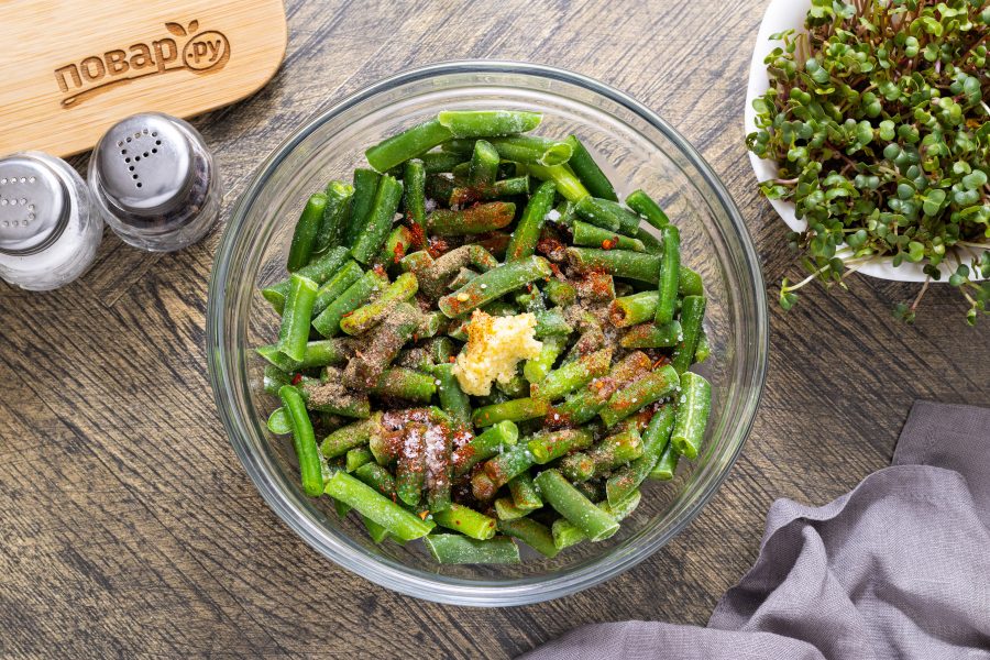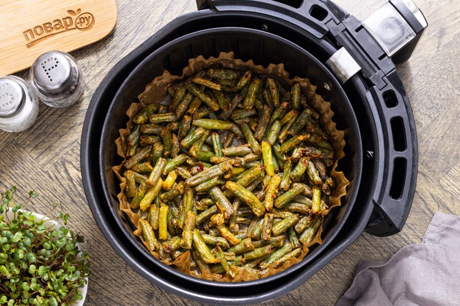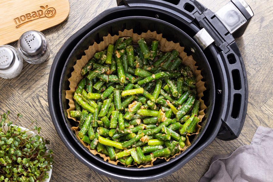 Предварительно разогрейте аэрогриль до 190 градусов. Выложите фасоль в корзинку аэрогриля. Готовьте фасоль 10-12 минут.